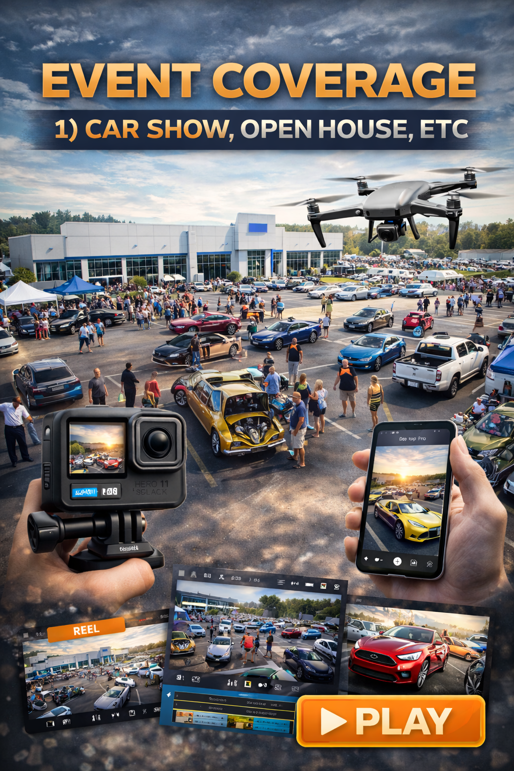 (1) Car show, Open House, Etc covered with GoPro, Drone, iPhone Pro, Photo editing, etc